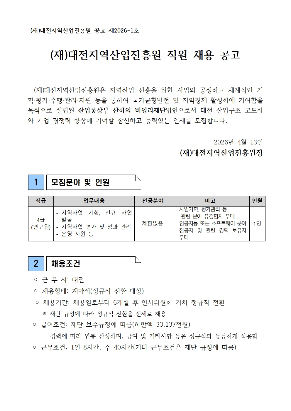 2026년 대전지역산업진흥원 직원 채용 공고